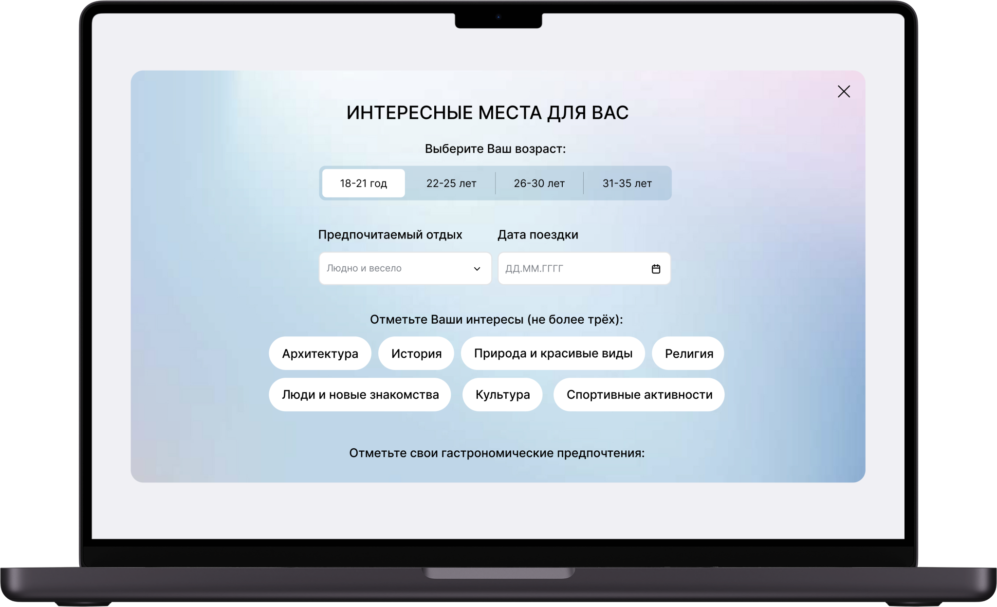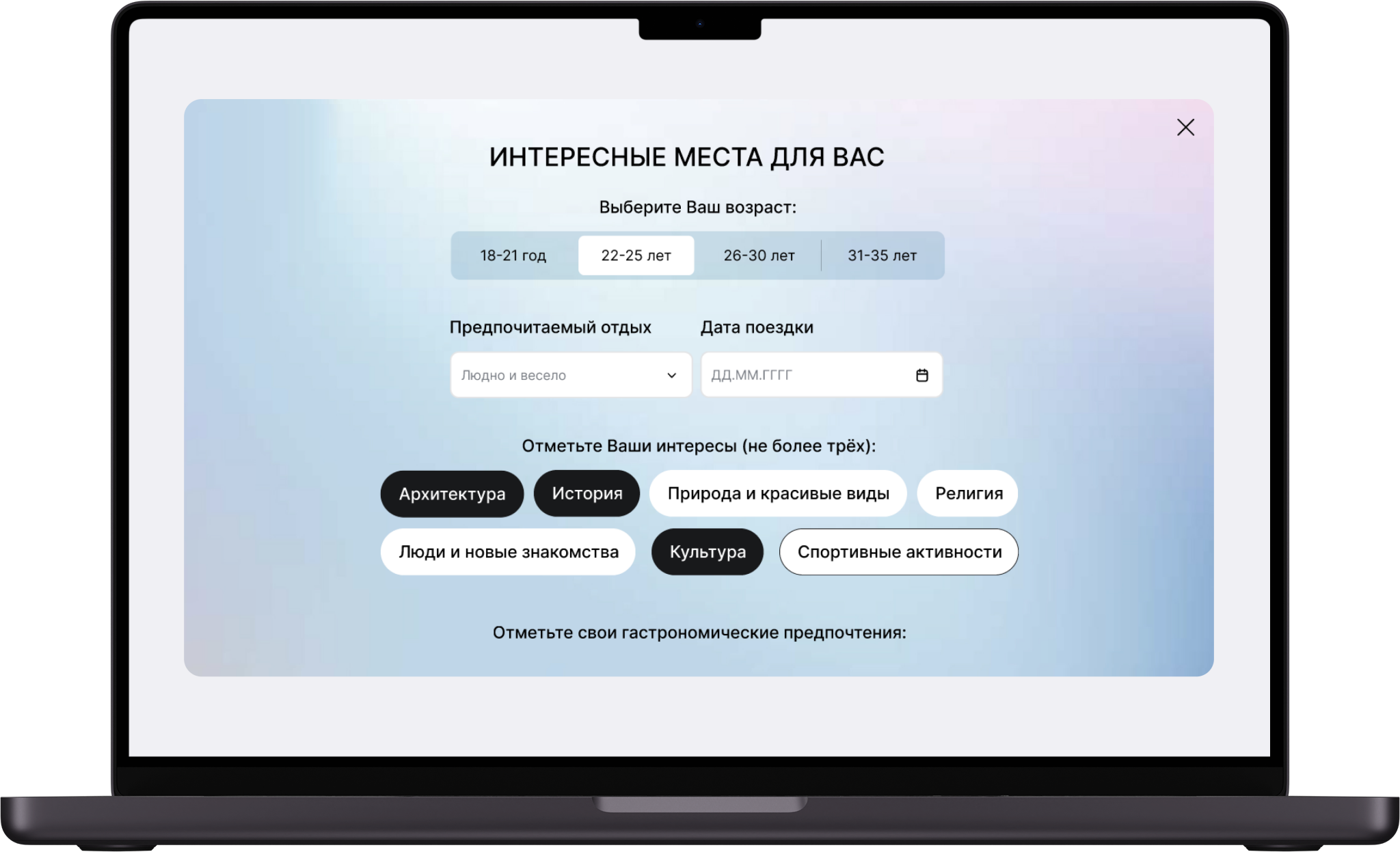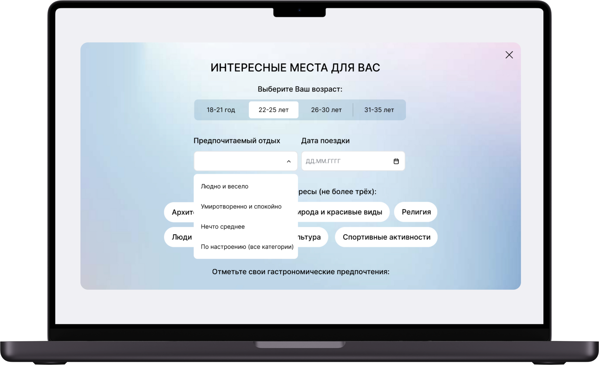 отвечает на несколько вопросов о предпочитаемом типе отдыха и получает три карточки с наиболее